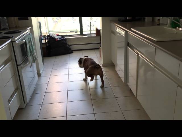 For some strange reason, the Bentley Bulldog reverse when he wants to get out of the kitchen.