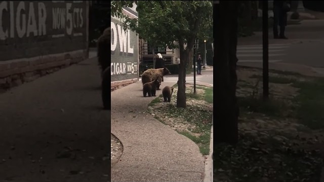 A bear family descends suddenly from a tree in the city of Aspen Colorado (USA).