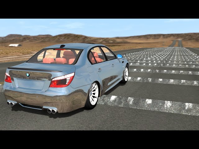 Various vehicles running at high speed over a hundred bumps arranged one after the other in the videogame BeamNG. drive, a vehicle Simulator developed by BeamNG Corporation.