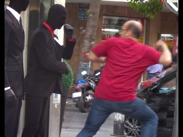 A funny prank in Beirut, where two men disguised as mannequins scaring passers.