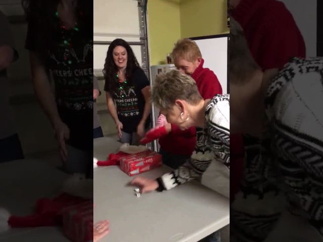 A family plays a pretty funny game after the Christmas table. The person who will manage the open gift, wins and content.
