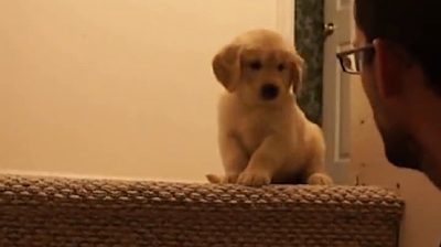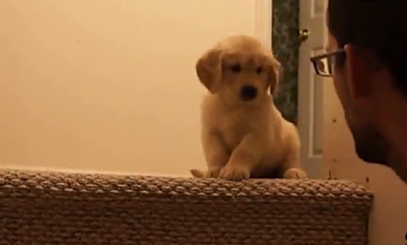 A man shows a puppy how to descend the stairs, and it faithfully follows the instructions of.