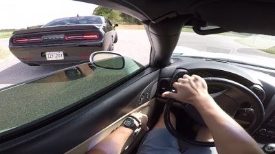 Two young men in a Chevrolet Corvette attempt to make plywood with an elderly in a Dodge Challenger.