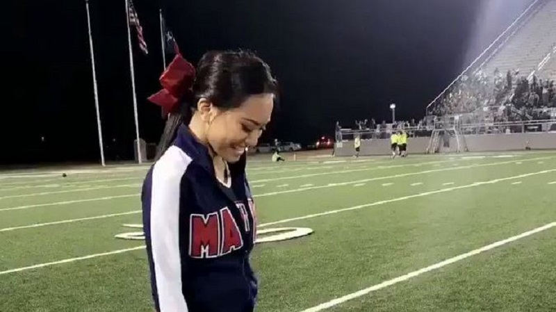 At the edge of the American football field Waller ISD, the cheerleader Ariel makes a nice trick pretending to walk on an invisible box.