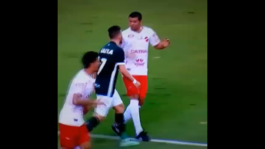 Match between Vila Nova and Goias in Brazil, footballers Rossi and Marcelo Cordeiro pretend while injured.