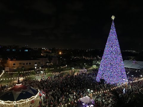 Thousands watch as Santa, lower right on ladder, lights the new 100’, $800,000 Christmas tree in Delray Beach, Florida. The tree replaces another 100-footer that suffered metal deterioration.