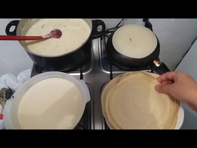 A man making pancakes with an ingenious method, using the bottom of a pan. Dips the bottom of the dough and then upside down position the pan in the oven. Within a few seconds, the pancake is ready.