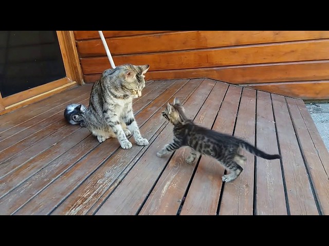 Mom cat cleans the little kitten of barely, when he realizes that he wants to avoid the bathroom.