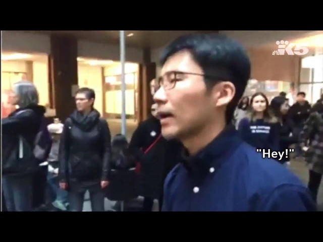 Short and concise, a Korean student stops the voices of protesters, at the Washington University library.