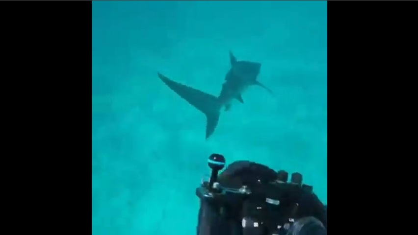 Diver filming a shark once has grabbed the mouth of a sea turtle. The shark realizes that he can not break the shell of the turtle and then immediately turns to the diver.