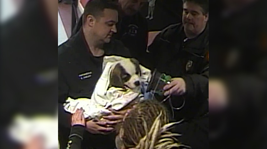 At City Police Department North Reading, Massachusetts, a fearful woman arrives with her puppy which was smothered by something that has swallowed. The police managed to bring the dog with ventilations.