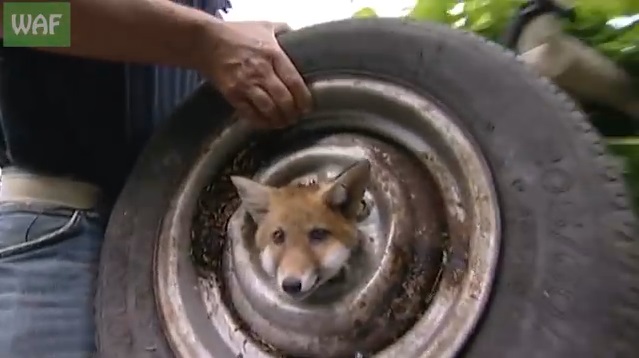 Members of the Wildlife Aid organization in Britain, help a young fox who was found with her head wedged in a car wheel.