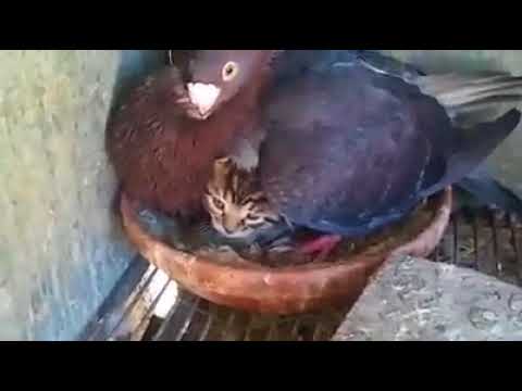 A pigeon watches a small kitten lying in the nest, and leaves no closer to.