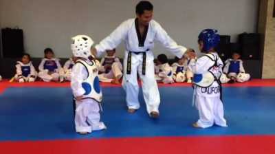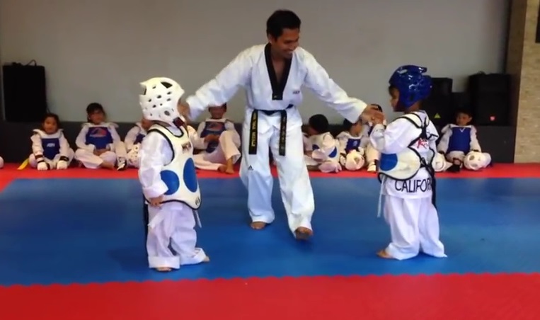 In a Taekwondo school in California, two small children 3 years face up to an enjoyable duel.