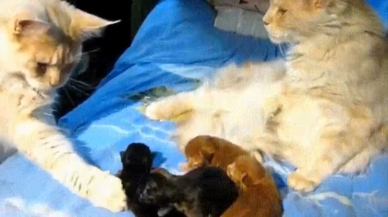 A cat looking curiously newborn kittens. However Mom seems very protecting the cubs.