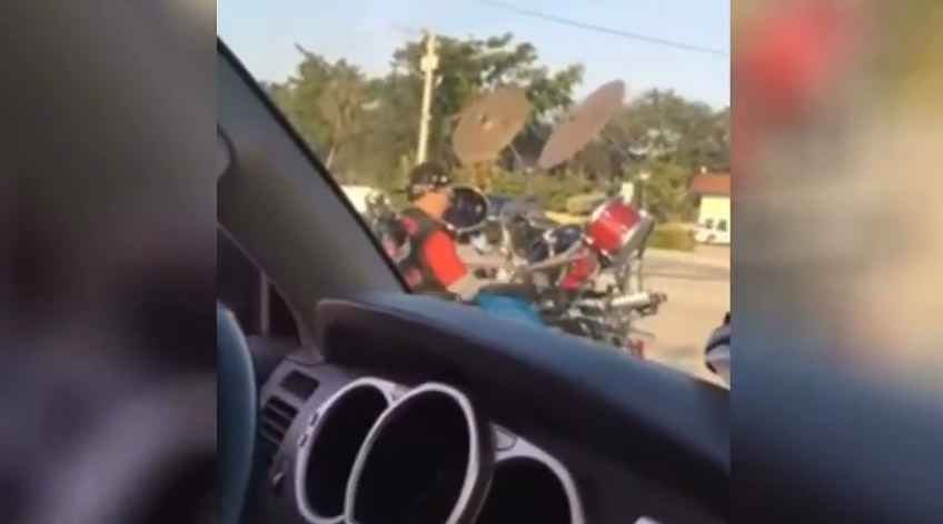 In a specially constructed motorcycle, a man playing drums while waiting red lantern. The track is 'Beat It' by Michael Jackson.