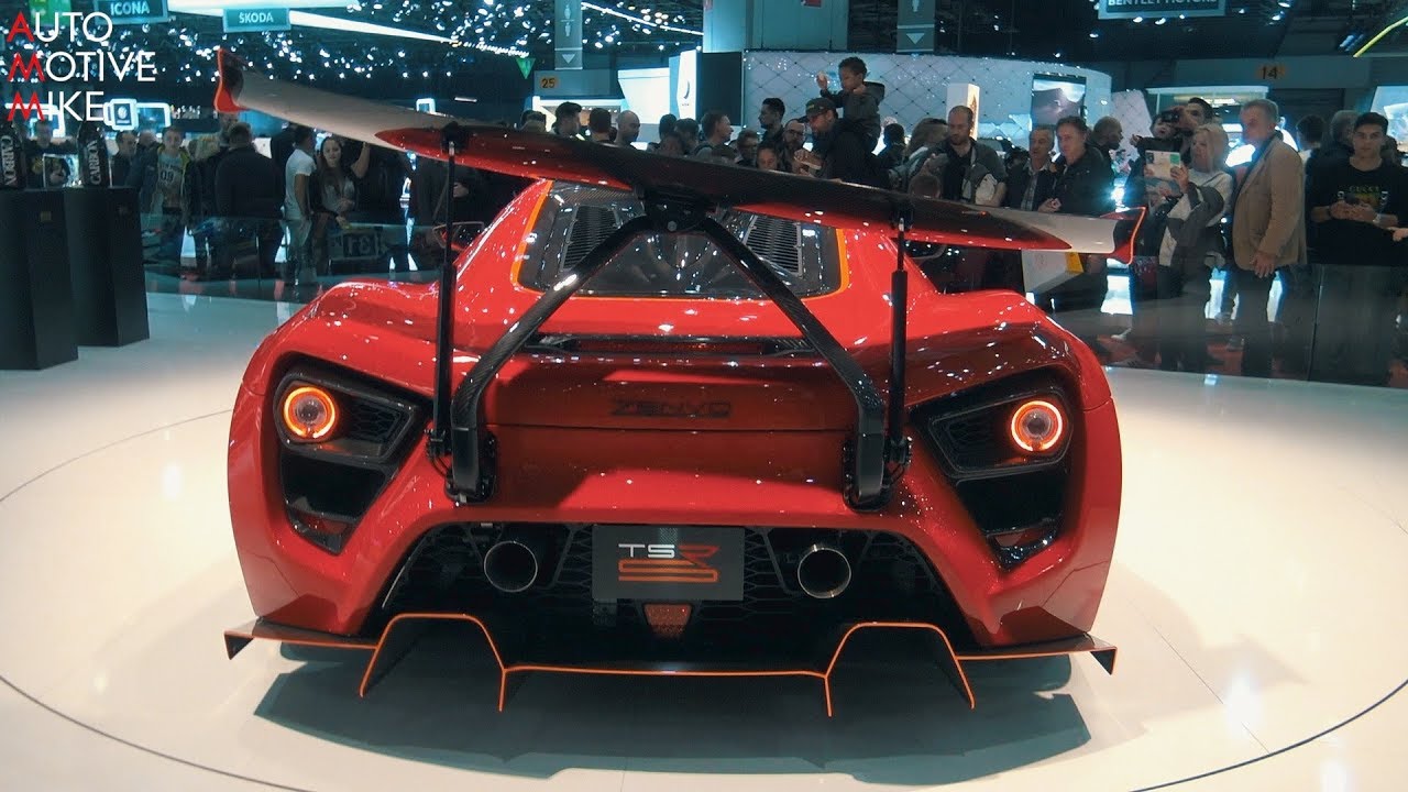 The supercar Zenvo TSR-S manufactured in Denmark, and features an interactive spoiler that adjusts to the driver's movements. The airfoil functions as air brake when the car brakes, and as a stabilizer in bends. The Zenvo TSR-S has a power of 1200 hp and does 0-100 2,8 seconds. Here we see the TT circuit of Assen in Holland.