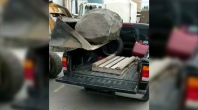 Two workers trying to load a stone of several tons on a van, with the help of an excavator.