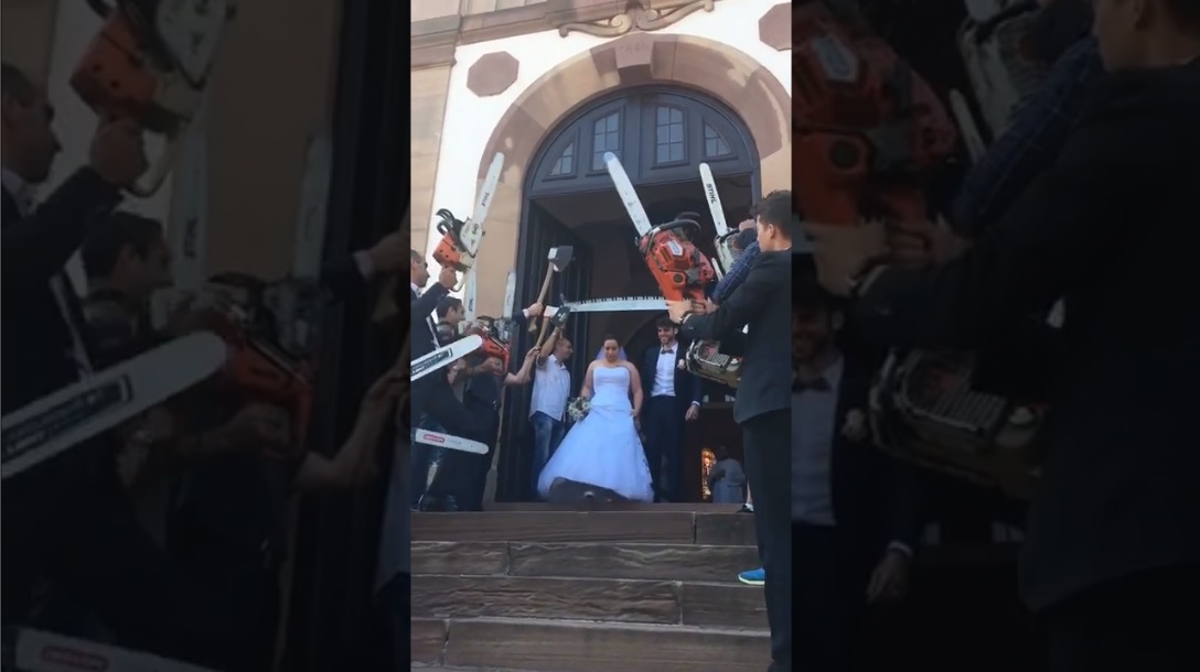 In the region Sainte-Marie-aux-Mines France, woodcutters attach value to their friend who marries creating an arch of chainsaws.