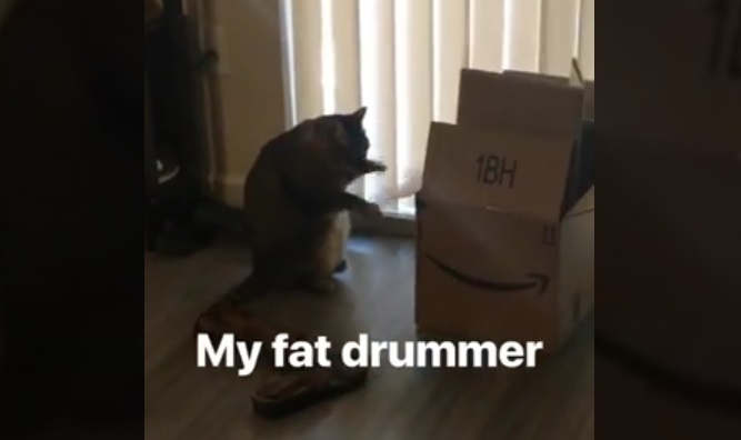 A cat strikes her legs rapidly on a cardboard box, like playing drums.