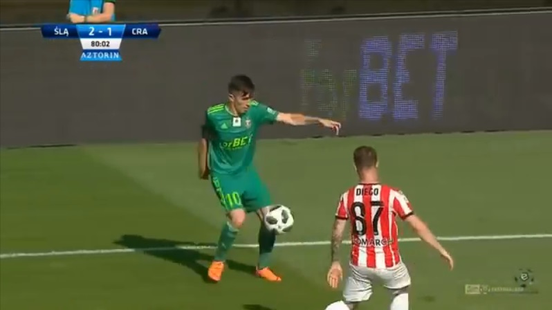 The Iranian footballer Farshad Ahmadzadeh Polish Śląsk, make a very spectacular ball stopping in a match against Cracovia.