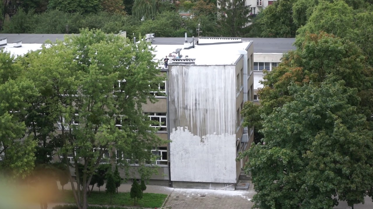 In Warsaw, Poland, a group of painters took to paint a wall of 15-20 meters at a primary school. But the 'professional' workers, They did not have the necessary equipment, ropes or scaffolding. So, They decided to improvise. They painted up there that reached the base, but they did it higher... mantara. We can see a young man pouring paint from the ceiling down and then trying to stretch the roll.