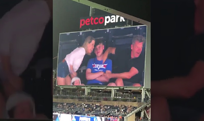 During half a baseball game in the United States, The camera focuses on a mother and a father dancing next to their son. The young seem particularly embarrassed by the incident.