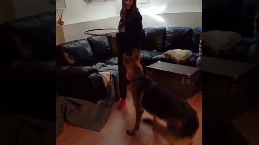 In New Jersey, The Sarge German shepherd saw the landlady of doing hula hoop and tried to imitate. He took the hoop with the mouth, and began circling around himself.