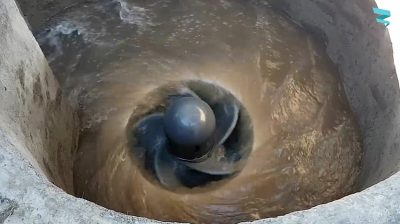 This small hydro turbine in Donihue Chile, exploiting the currents of a river and feeds a house. It produces 15kw and built by engineers of the company Turbulent Hydro.
