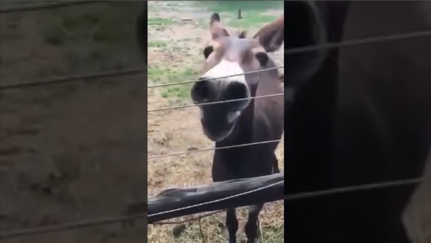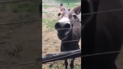 A donkey begins to cry just heard the voice of the owner. of course knows that waiting for some delicious fruit.