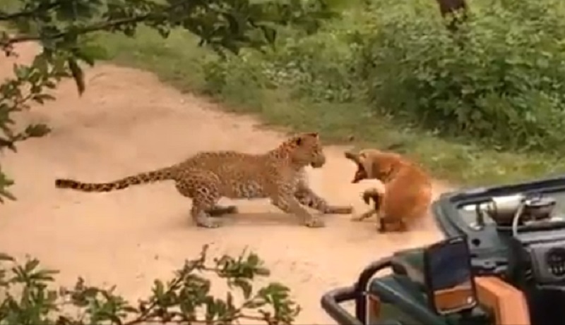 Sunday September 2, a group of visitors in Jhalana Safari Park in India's Jaipur, They saw a face to face meeting between a dog and a leopard. The dog slept on a path where the leopard jumped out of a bush to attack him. The dog then started barking woke the leopard, which stopped its attack remained motionless in front of the dog for several seconds. A forester told: 'The leopard went quietly because there were visitors in the jeep behind the dog. Different, it is unlikely that the dog would survive this showdown ».