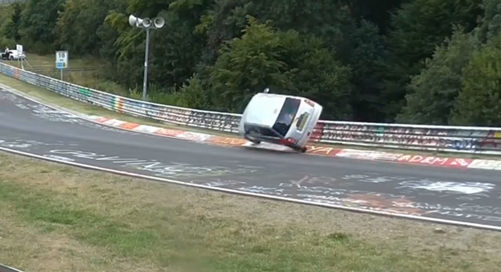 A driver in a Daihatsu Cuore sufficiently luck, saves his car overturned before a turn of the Nürburgring track in Germany.