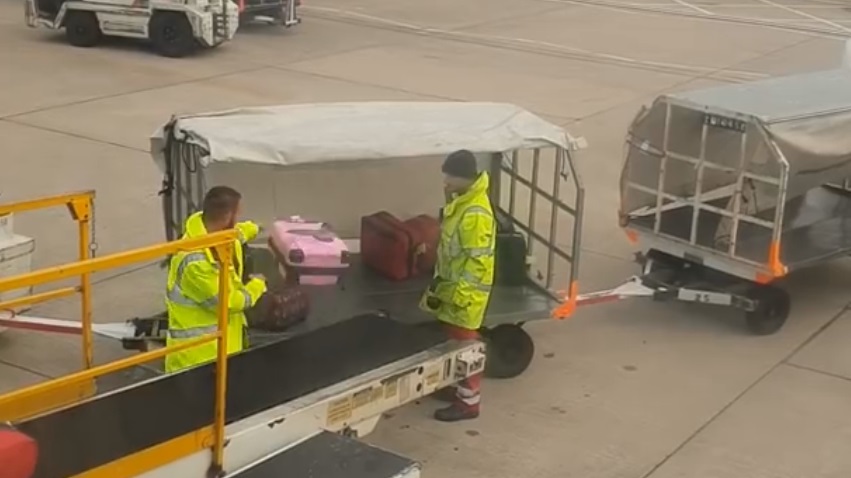 A baggage handler at Manchester Airport throwing luggage in a cart too carelessly, and they fall on the other side.