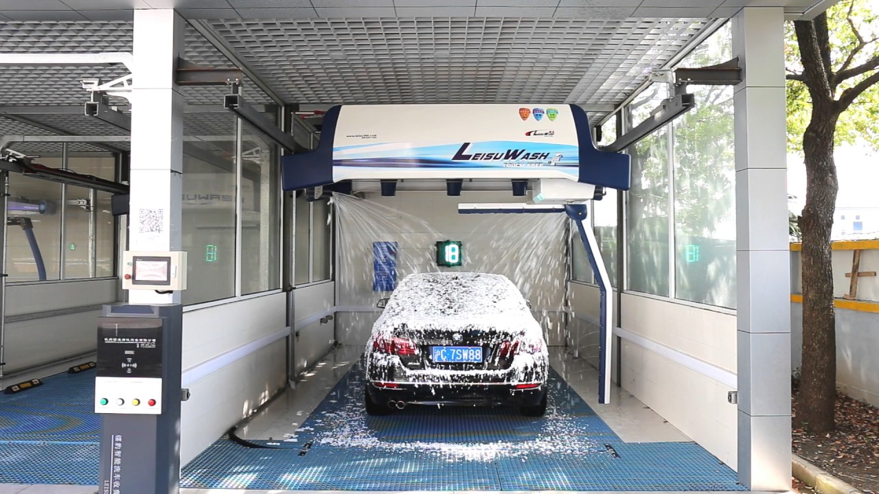 Demonstration of automatic car wash Leisuwash 360, without a conventional cylindrical brushes, but only works with water at high pressure. Are Chinese-made and available here.