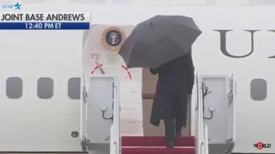 Donald Trump goes with an umbrella to the presidential plane, but he seems not to be interested in how to close it. So, he simply leaves it on the door.
