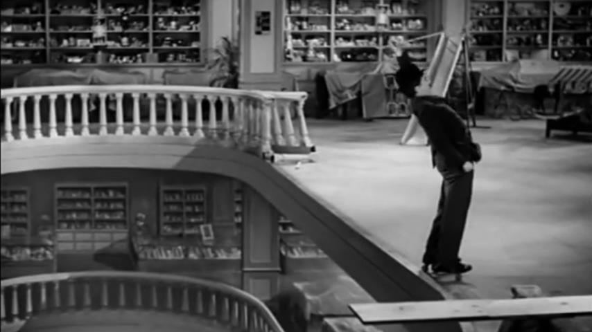 In the 1936 film 'Modern Times' with Charlie Chaplin, They used a very clever trick of perspective with the camera, in order to add an effect.