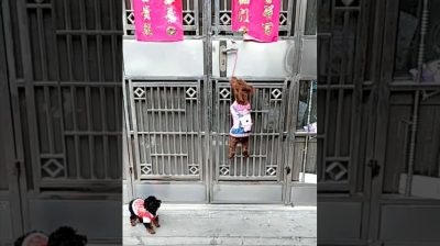 A dog in China opens the door just arrives at his doorstep, and a second then ensures that the door remain closed.