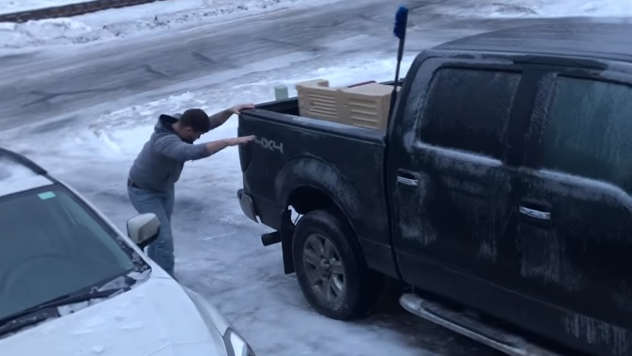A father in the town of Palmer Alaska, trying to pull a plastic kitchen from the flatbed of the van to bring it to his daughter. But the courtyard is frozen by snow and the man glides continuously to the street.