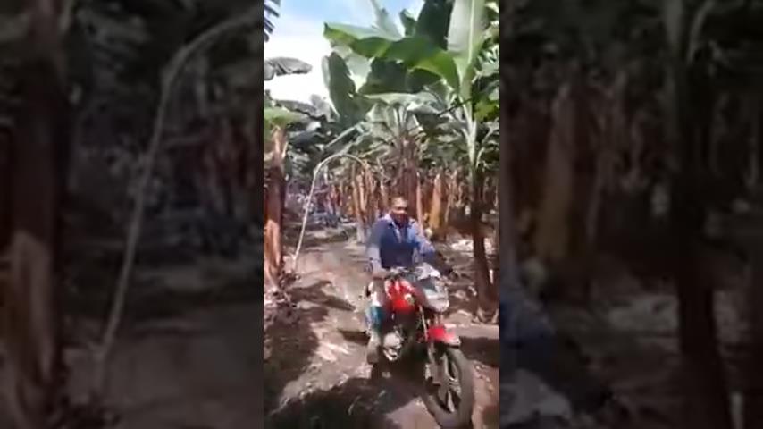 In a banana plantation, the fruit after harvest are transferred to a system of pulleys, with the help of a motorcycle.