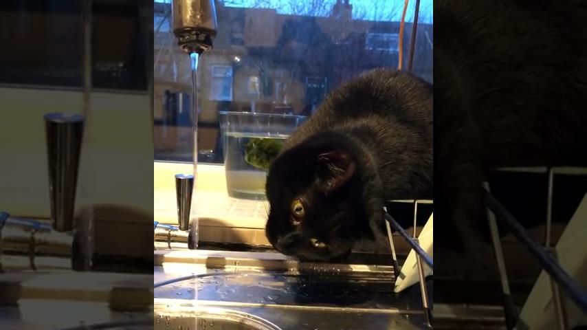A cat is captured by water flowing from a faucet, and makes funny faces.