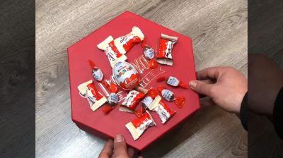 An 'explosive' box contains different varieties of Kinder chocolates, gradually revealed during the opening.