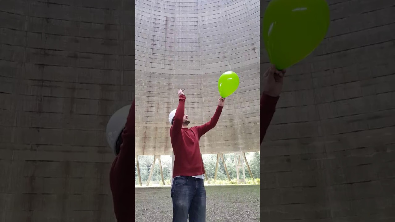 In the cooling tower of an abandoned city Elma Washington nuclear plant, a man trying to pop a balloon.