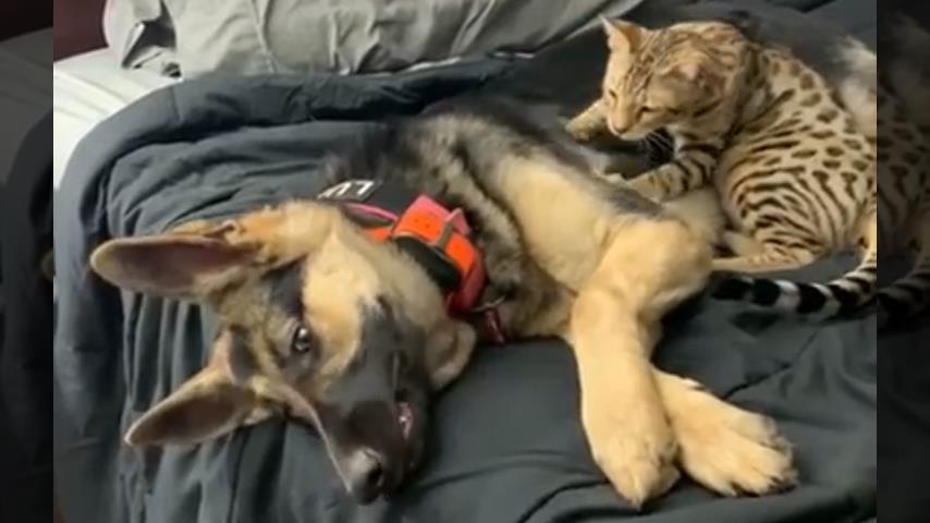 A savannah cat rubs her feet in the coat of a German Shepherd enjoying the massage lying in bed.