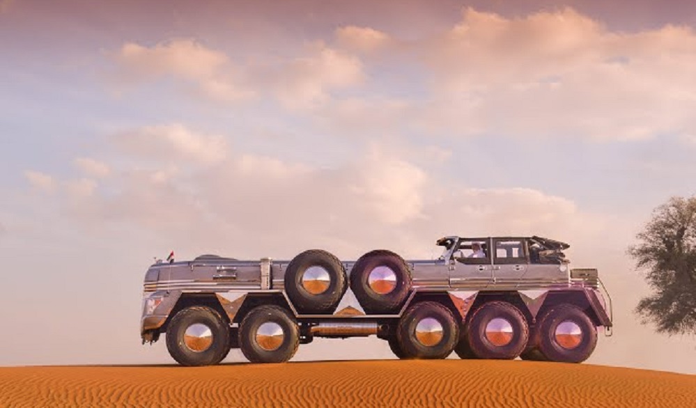 Called Dhabiyan and has a length of over 10 meters, a height of 3 meters width and almost 2,5 meters. Constructed by a military truck, in particular the chassis of a Oshkosh M1075. Undoubtedly the most impressive, except dimensions, are 10 huge wheels.
