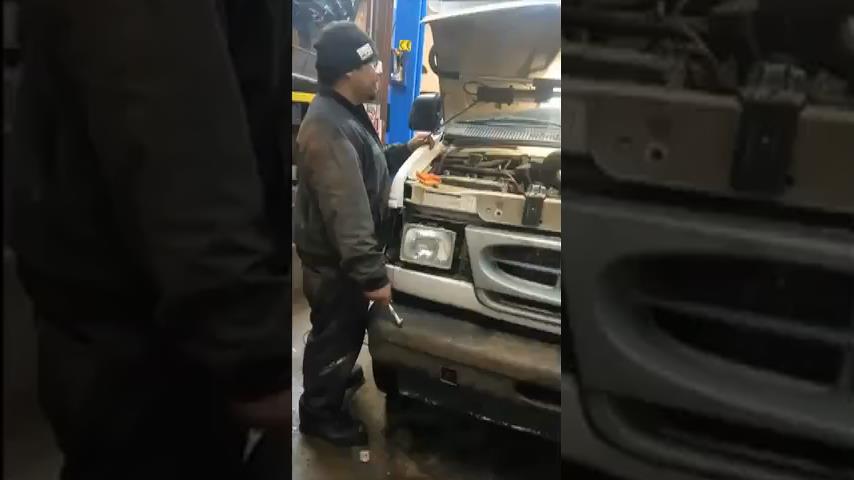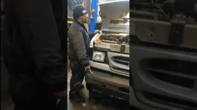 An engineer makes a plate to his colleague when the second begins in a truck engine under repair in a workshop. Hits the front bumper with a tool to simulate a suspicious noise in the engine.