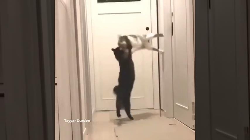 A cat will make an impressive wrestling hold another cat, while the second is in the air.