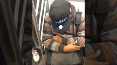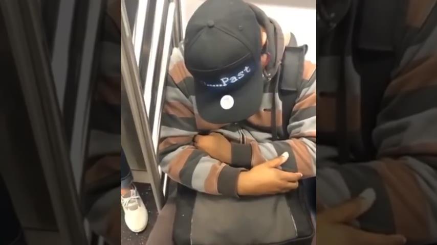 A man sleeping on the New York subway, wearing a hat with an electronic sign on the facade. The message asks his passengers to wake him before losing his attitude.