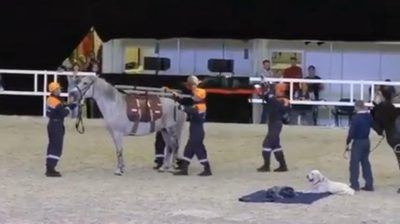 During a rescue demonstration in Russia, a team of rescuers show us how to transport an injured person on a stretcher using a horse. Unfortunately, The demonstration does not go as planned. The horse panicked, and will start galloping trying to get rid of the stretcher with the injured man - doll.