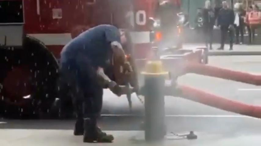 A firefighter receives a blow from the water pressure, after opening of a fire hydrant.