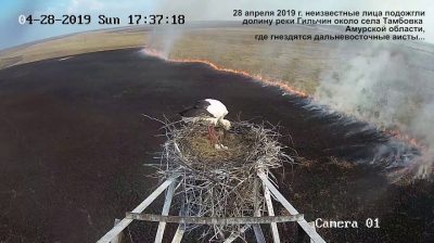 A fire develops in a valley below the nest of a stork, located on an electricity pylon near Tambovka Russia. Every year burned several stork nests, and eggs and hatchlings in nests located on trees. This time, the stork is fortunate and the nest is saved from the flames.